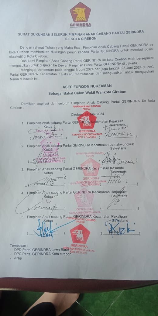 Dukungan tersebut telah dikukuhkan melalui surat pernyataan bersama yang ditandatangani oleh lima ketua PAC Partai Gerindra se-Kota Cirebon.
