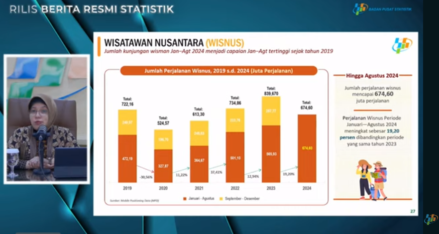 Sehingga secara kumulatif, hingga Agustus 2024, jumlah perjalanan wisnus mencapai 674,60 juta perjalanan.