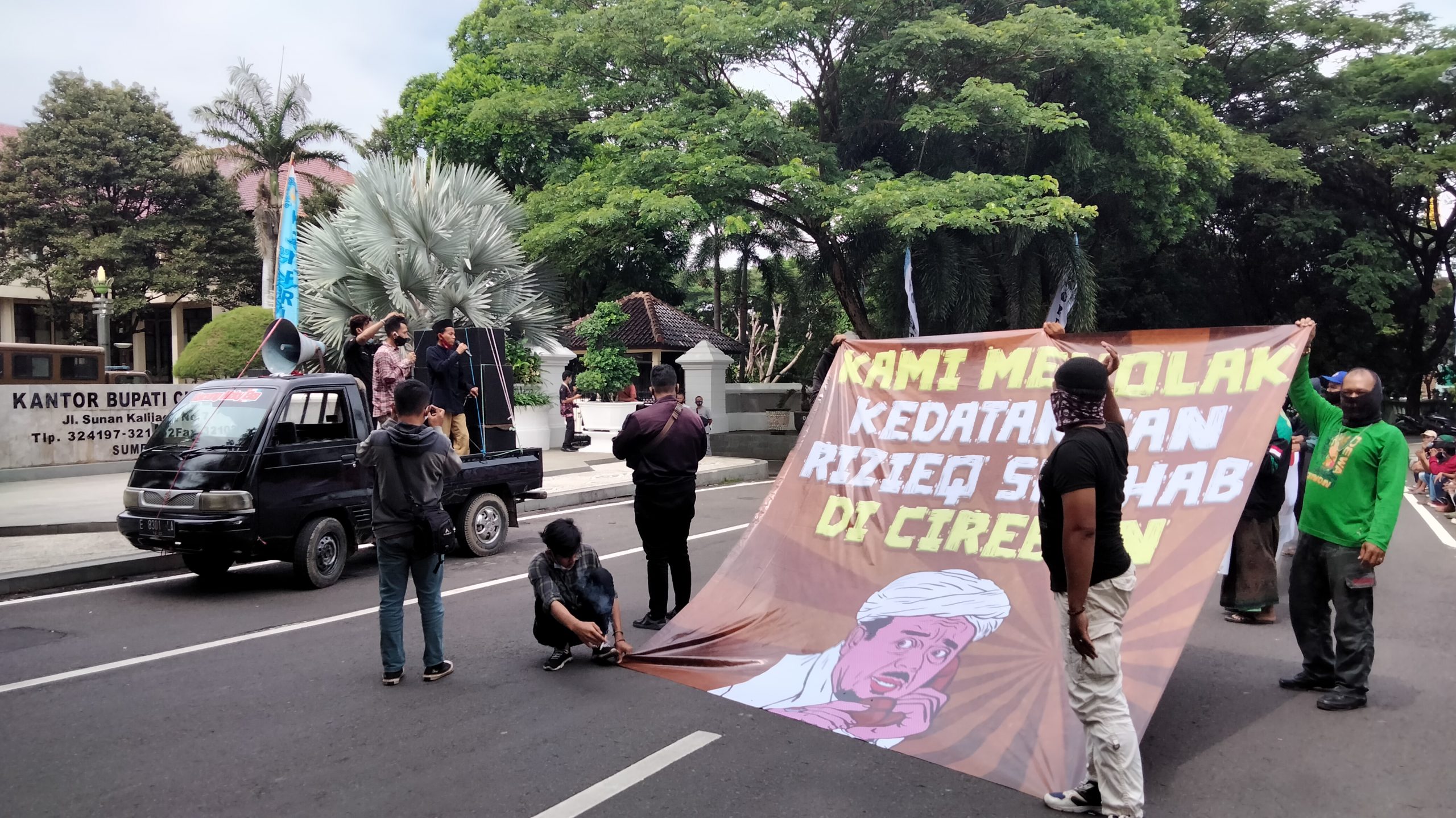 Dalam unjuk rasa tersebut, massa menyampaikan penolakan terhadap rencana kedatangan HRS ke Cirebon. Bahkan, mereka tampak membentangkan spanduk bertuliskan ‘Kami Menolak Kedatangan Rizieq Syihab ke Cirebon’ yang berukuran cukup besar.