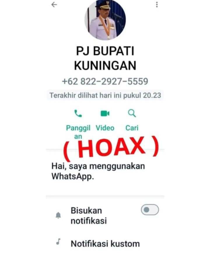 Pj Bupati Kuningan Raden Iip Hidajat menegaskan, bahwa akun tersebut palsu dan menghimbau kepada masyarakat agar tidak mudah percaya dan menanggapi modus dari nomor akun Whatsapp palsu tersebut.
