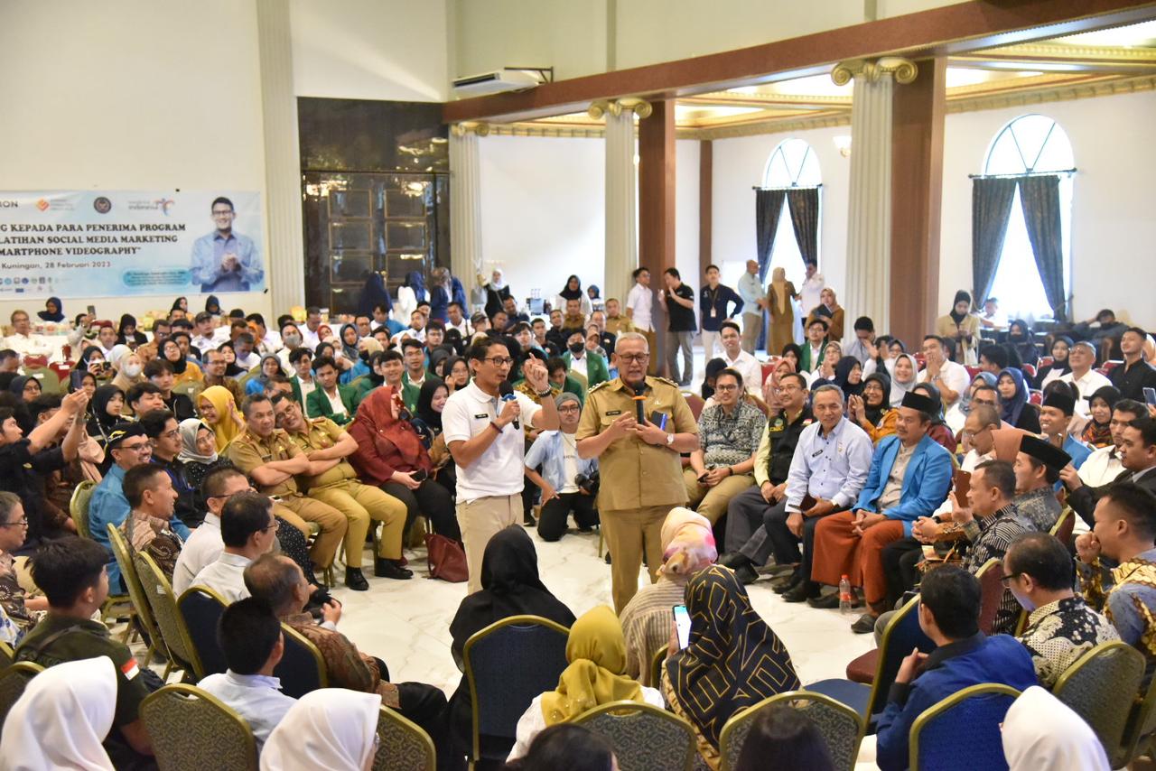 KUNINGAN, (FC).- Menteri Pariwisata dan Ekonomi Kreatif (Menparekraf) Republik Indonesia, Sandiaga Salahudin Uno bersama Bupati Kuningan H. Acep Purnama kolaborasi menjadi mentor pada acara Beasiswa Pelatihan Konten Creator dan Photograpy di salah satu hotel di Kuningan.