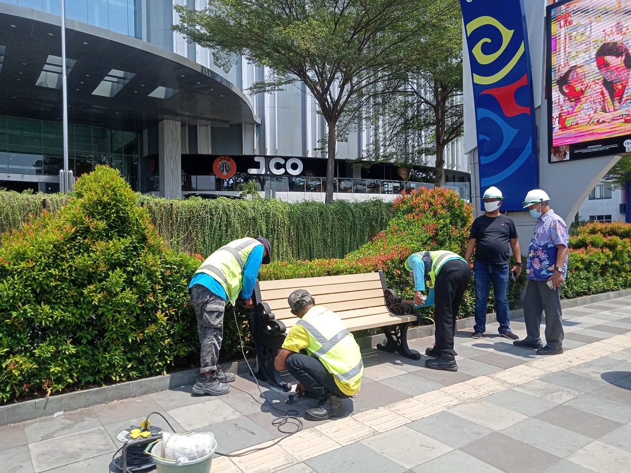 “Ada empat unit bangku dan tiang portal untuk mencegah pengendara motor naik trotoar. Bulan depan Insya Allah akan ditambah lagi. Kami juga meminta pihak mall atau instansi yang kebetulan dipasang bangku tersebut, untuk membuat background seindah mungkin. Sehingga menjadi spot selfi yang menarik,” imbuhnya.
