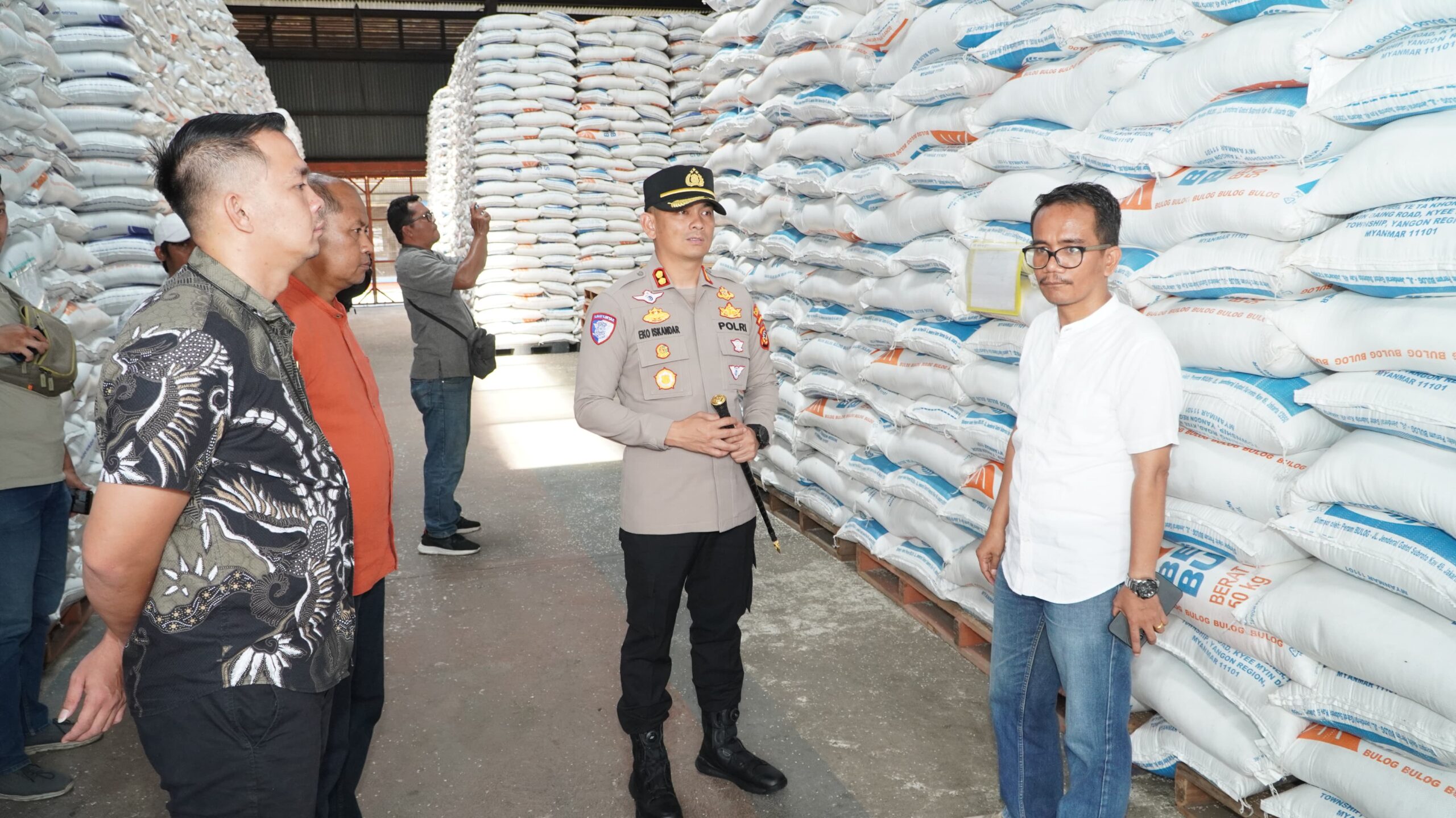 Kapolres Cirebon Kota AKBP Eka Iskandar didampingi Kepala Perum Bulog Cabang Cirebon, Ramaijon, tinjau stok beras di Gudang Bulog Cirebon yang saat ini mencapai 84.500 ton,Jumat (28/2). (Foto: Ist/FC)