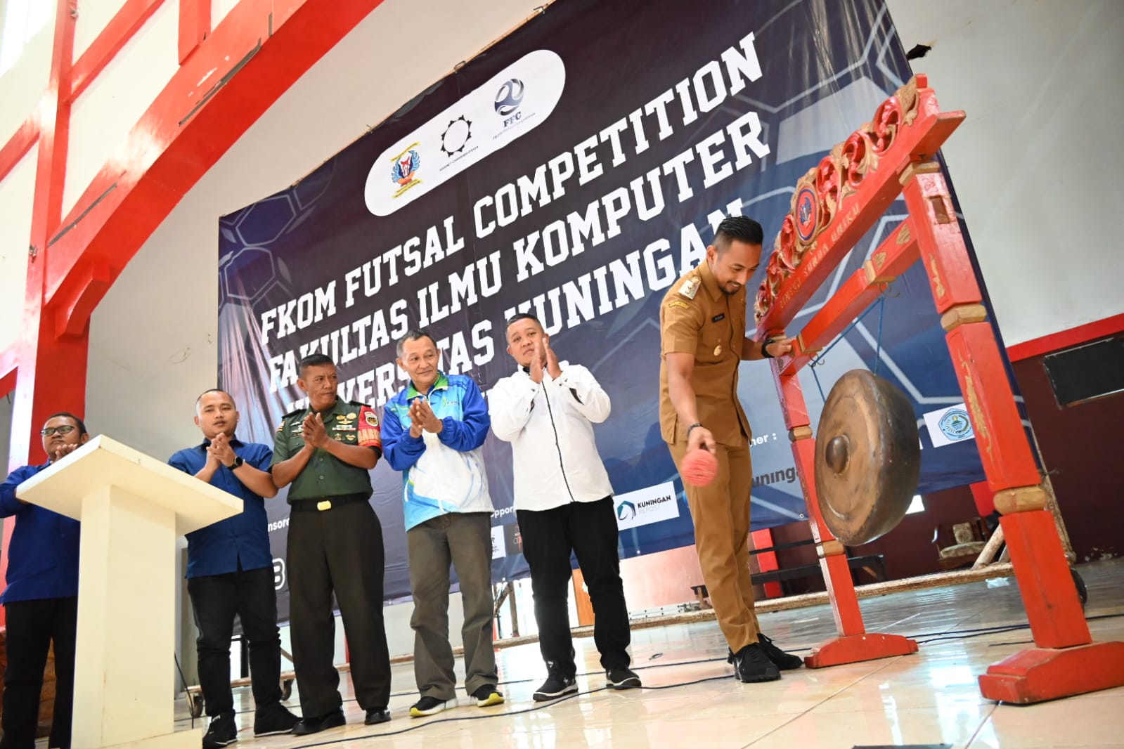 Acara dilanjut dengan pemukulan gong oleh Wakil Bupati Kuningan disaksikan oleh para tamu undangan dan peserta sebagai simbol dimulainya acara FKOM Futsal Competition. (Ali)