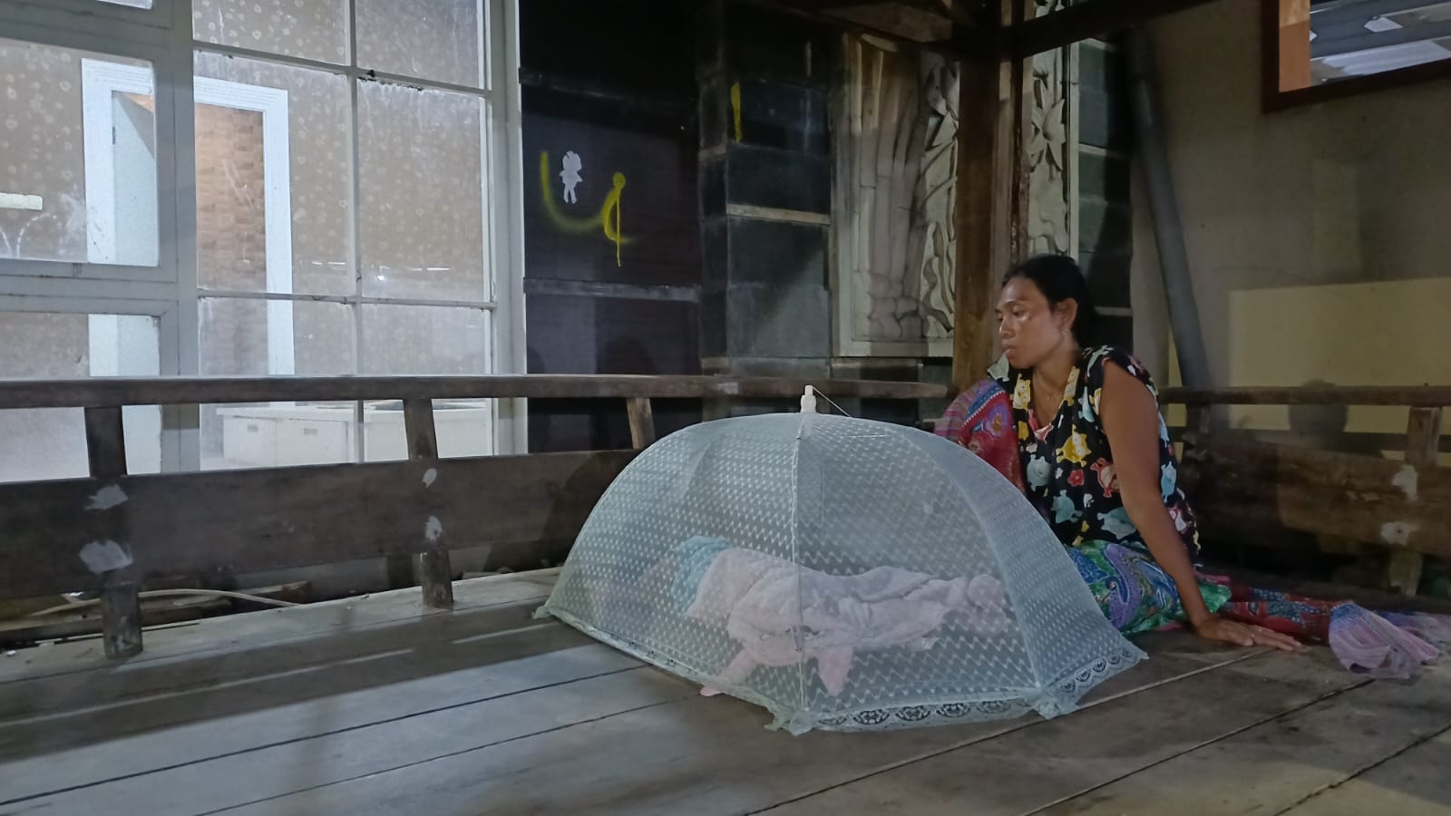 Perempuan tersebut hidup bersama anaknya, Siti Karisah, yang masih berusia sekitar tujuh bulan. Gazebo sederhana di seberang dapur MBG menjadi tempat berteduh satu-satunya dari panas dan hujan.