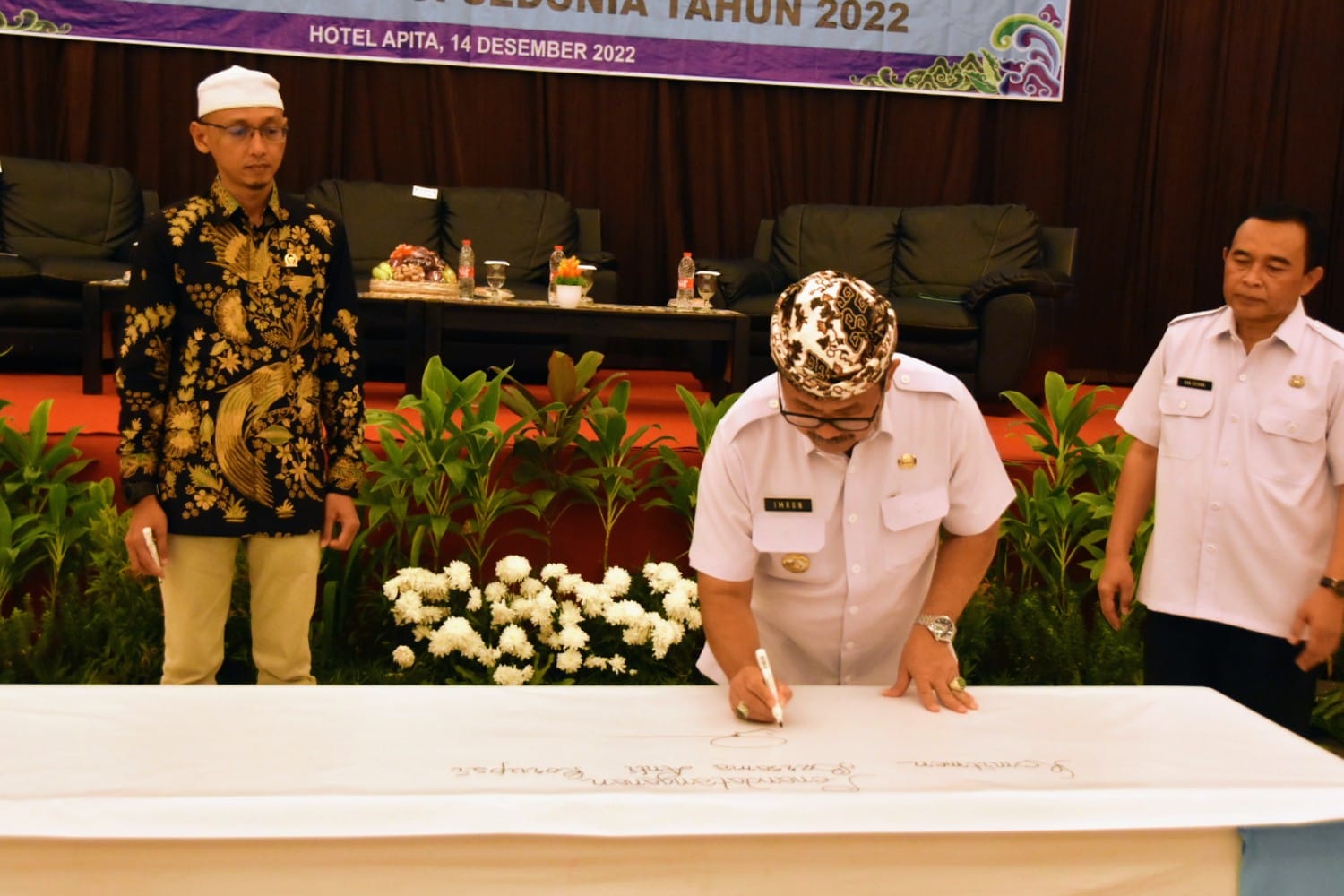 BUPATI CIREBON, H Imron tengah menandatangani komitmen bersama anti korupsi pada peringatan Hari Anti Korupsi se-Dunia tingkat Kabupaten Cirebon.*