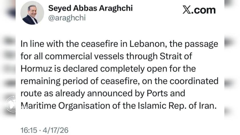 Menteri Luar Negeri Abbas Araghchi, dalam sebuah unggahan di platform X, menyatakan bahwa “sejalan dengan gencatan senjata di Lebanon, jalur bagi semua kapal komersial melalui Selat Hormuz dinyatakan sepenuhnya terbuka untuk sisa periode gencatan senjata” dan menjelaskan bahwa lalu lintas komersial akan berjalan “melalui rute terkoordinasi seperti yang telah diumumkan oleh Organisasi Pelabuhan dan Maritim Republik Islam Iran.”