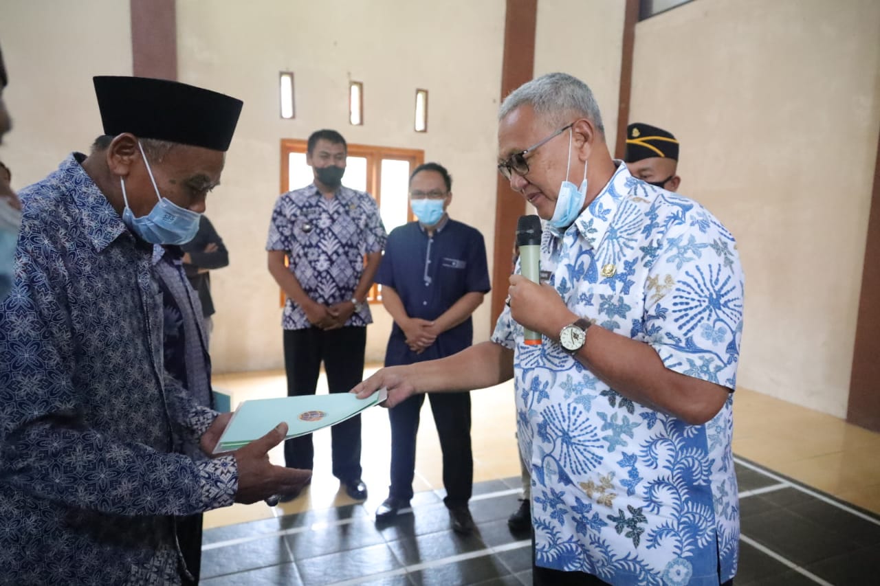 Penyerahan Sertifikat Kegiatan Konsolidasi Tanah Untuk Rakyat Tahun Anggaran 2021 dihadiri Bupati Kuningan Acep Purnama, Kajari Kuningan Dudi Mulyakusumah, dan Kepala BPN Kuningan Surahman.