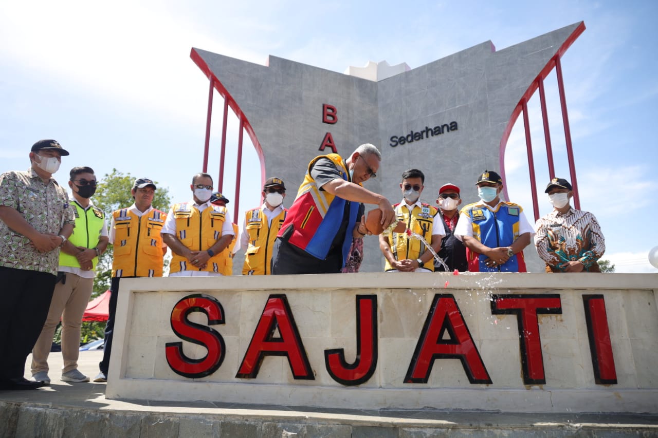Kamis (7/4), Bupati Kuningan H Acep Purnama disaksikan Kepala Balai Besar Pelaksanaan Jalan Nasional (BBPJN) DKI Jakarta – Jawa Barat Wilan Oktavian, didampingi Staff BBPJN DKI Jakarta – Jawa Barat Dedy Hariadi, serta Kadis PUTR H.M. Ridwan Setiawan, Kepala Bappeda Kuningan Usep Sumirat dan undangan lainnya menyiramkan air kendi ke area Tugu Sajati sebagai tanda difungsikannya jalan tersebut.