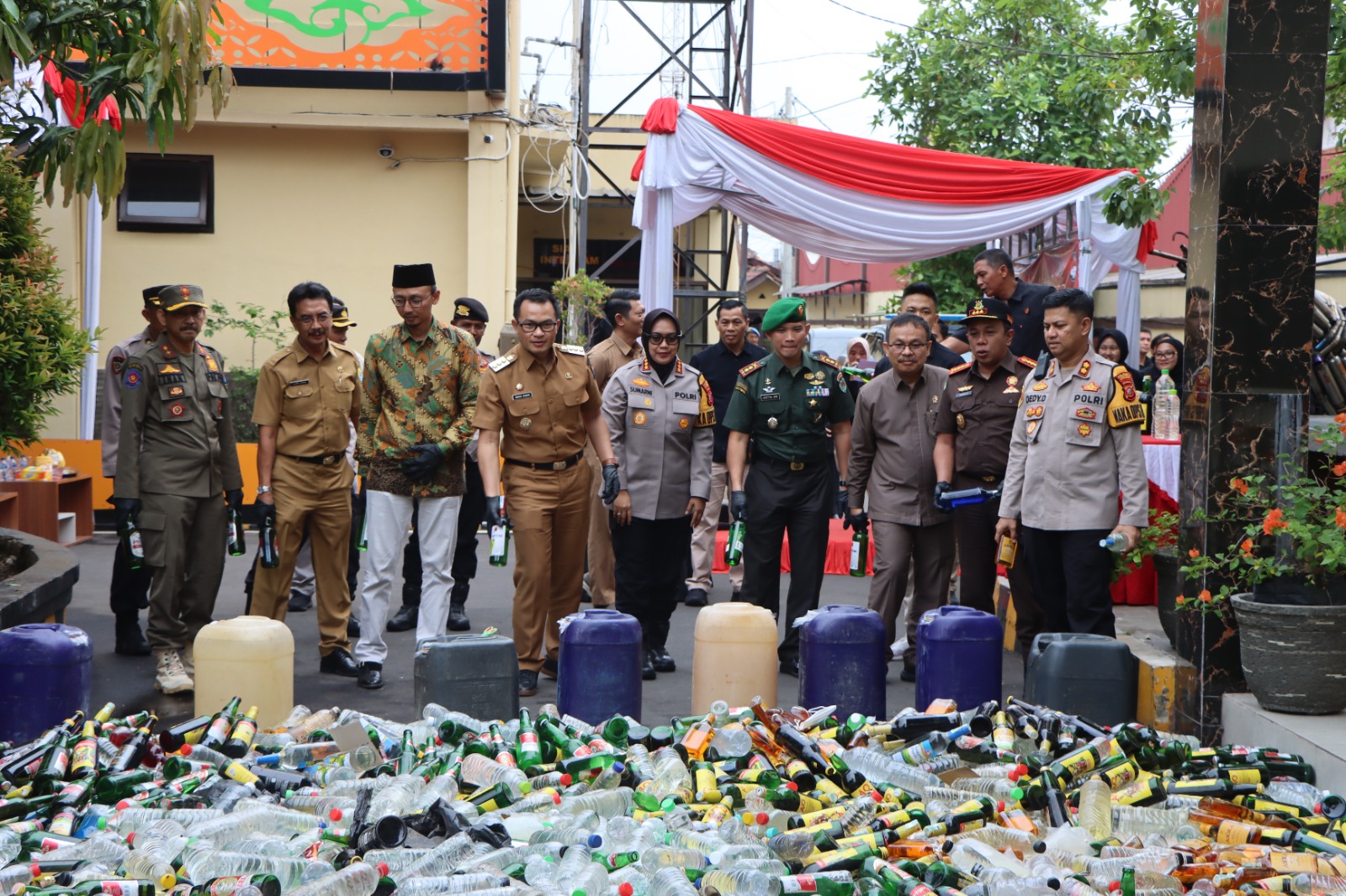 KAB. CIREBON, (FC).- Dalam rangka menjaga kondusifitas kamtibmas jelang hari Raya Iduladha 1445 Hijriyah. Polresta Cirebon memusnahkan ribuan minuman keras (miras) berbagai merek, Selasa (11/6). Miras yang dimusnahkan di Mapolresta Cirebon tersebut merupakan hasil KRYD dan Operasi Pekat Polresta Cirebon serta Polsek jajaran.