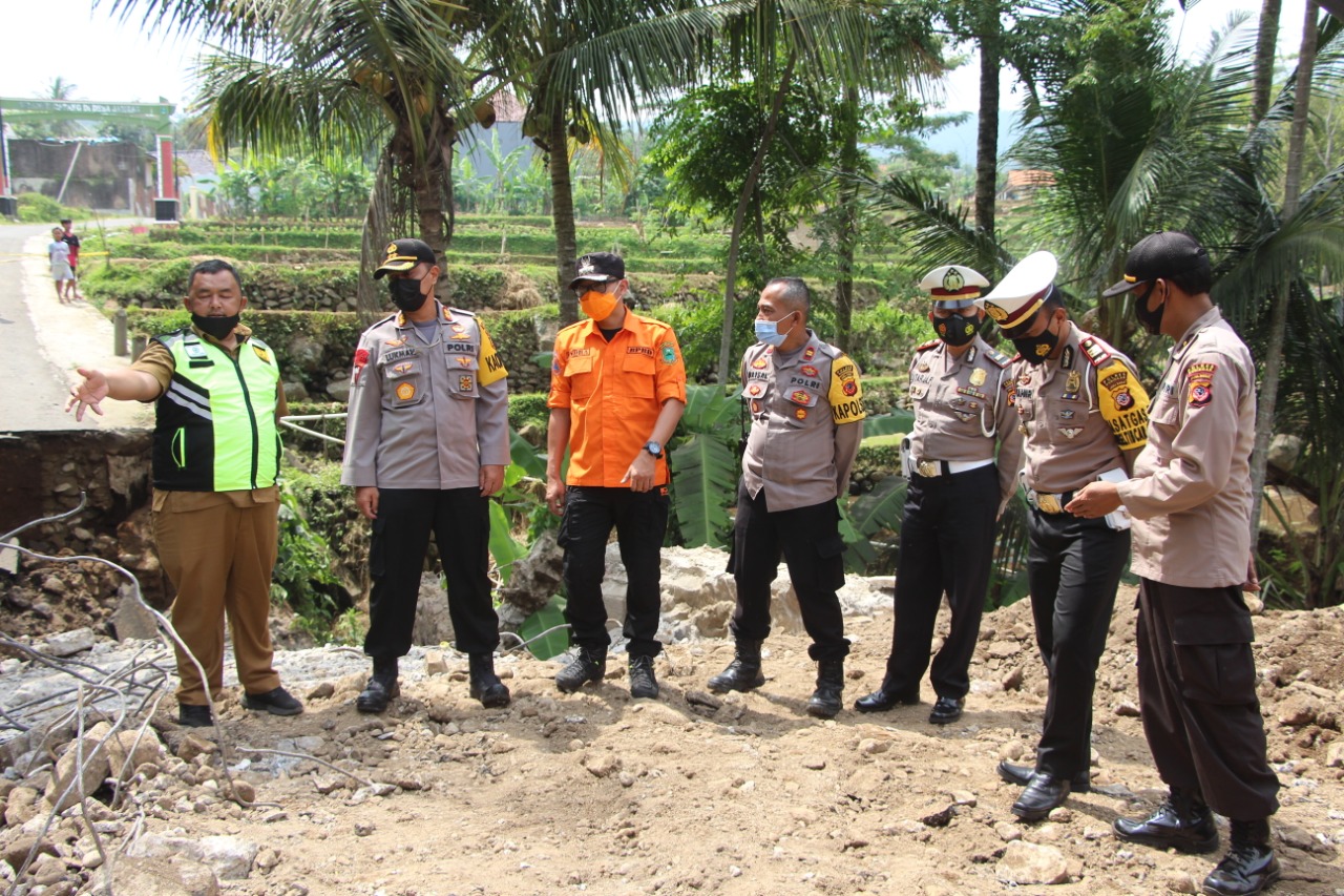 KUNINGAN, (FC).- Kapolres Kuningan AKBP. Lukman Syafri Dandel Malik meninjau lokasi jembatan ambruk di perbatasan Desa Ciherang Kadugede dan Desa Jambar Kecamatan Nusaherang, Senin (9/11).