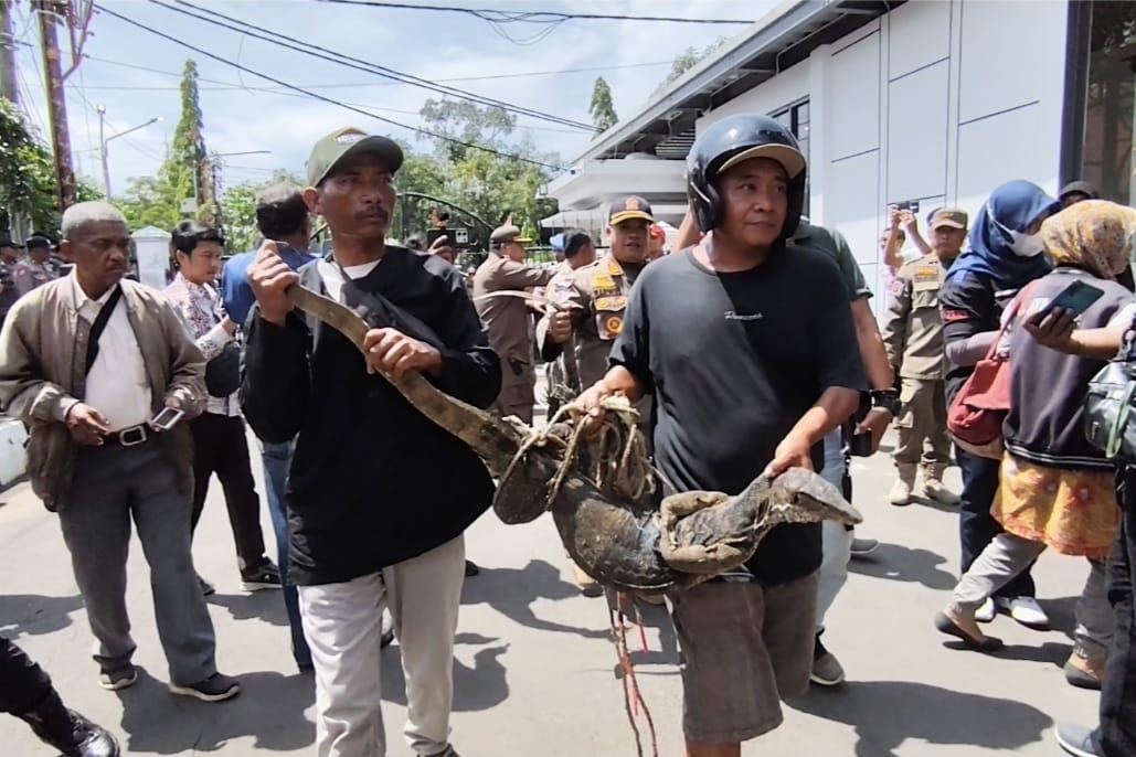 Massa yang tergabung dalam Koalisi Masyarakat Pesisir Indramayu (KOMPI) membawa tiga ekor biawak berukuran besar sebagai simbol kritik terhadap lingkungan birokrasi di lingkaran pendopo.
