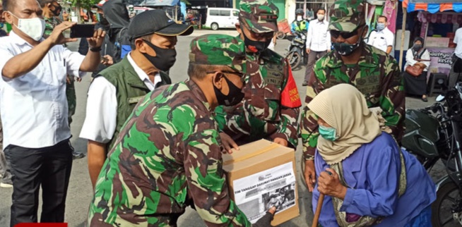 MAJALENGKA,(FC).– Kodim 0617 Majalengka menggelar bakti sosial membagikan masker dan paket sembako untuk penyandang cacat dan warga di sekitar pasar Cigasong Majalengka, Rabu (2/9).