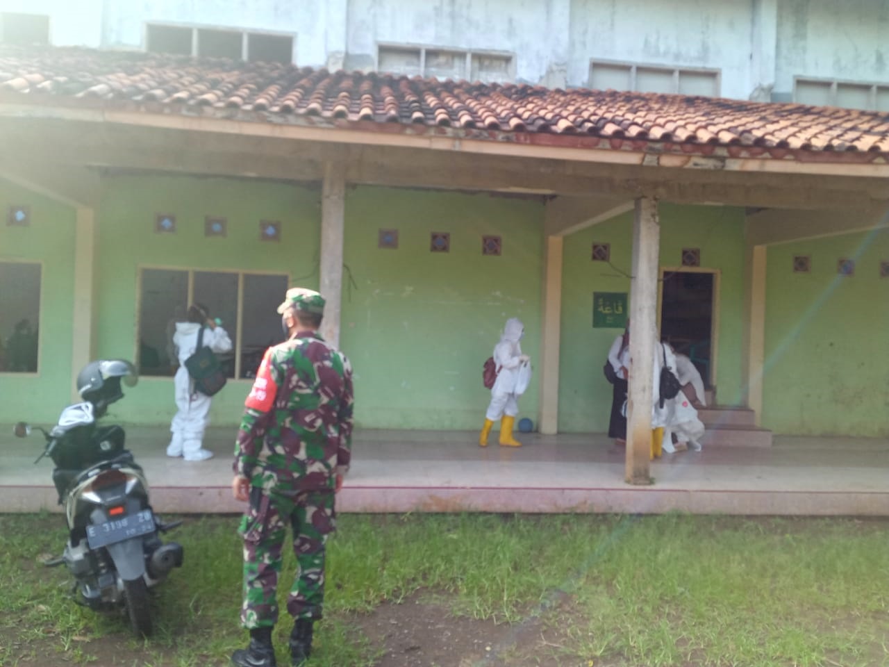 KUNINGAN, (FC).- Anggota Koramil 1509/Ciawigebang, Serda Hermawan memantau jalannya Polymerase Chain Reaction (PCR) di asrama putri Pondok Pesantren Modern Al-Ikhlas Dusun Wage RT 4 RW 4 Desa Ciomas, Kecamatan Ciawigebang, Rabu (2/6).