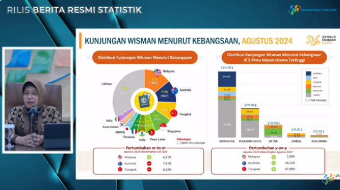 Plt. Kepala Badan Pusat Statistik, Amalia Adininggar Widyasanti mengatakan, pada bulan Agustus 2024, kunjungan wisatawan mancanegara atau wisman melalui pintu masuk utama sebanyak 1.177.652 kunjungan.