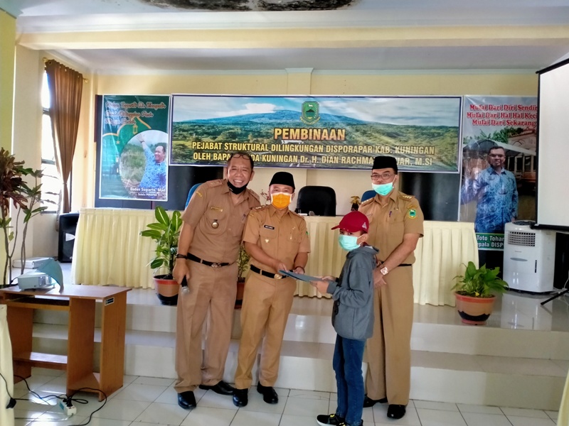 Penyerahan hadiah secara simbolis kepada pemenang dilakukan bersamaan kegiatan pembinaan pejabat struktural di lingkungan Disporapar Kabupaten Kuningan. Hadiah diserahkan langsung oleh Sekda Kuningan, Dian Rachmat Yanuar kepada juara pertama.