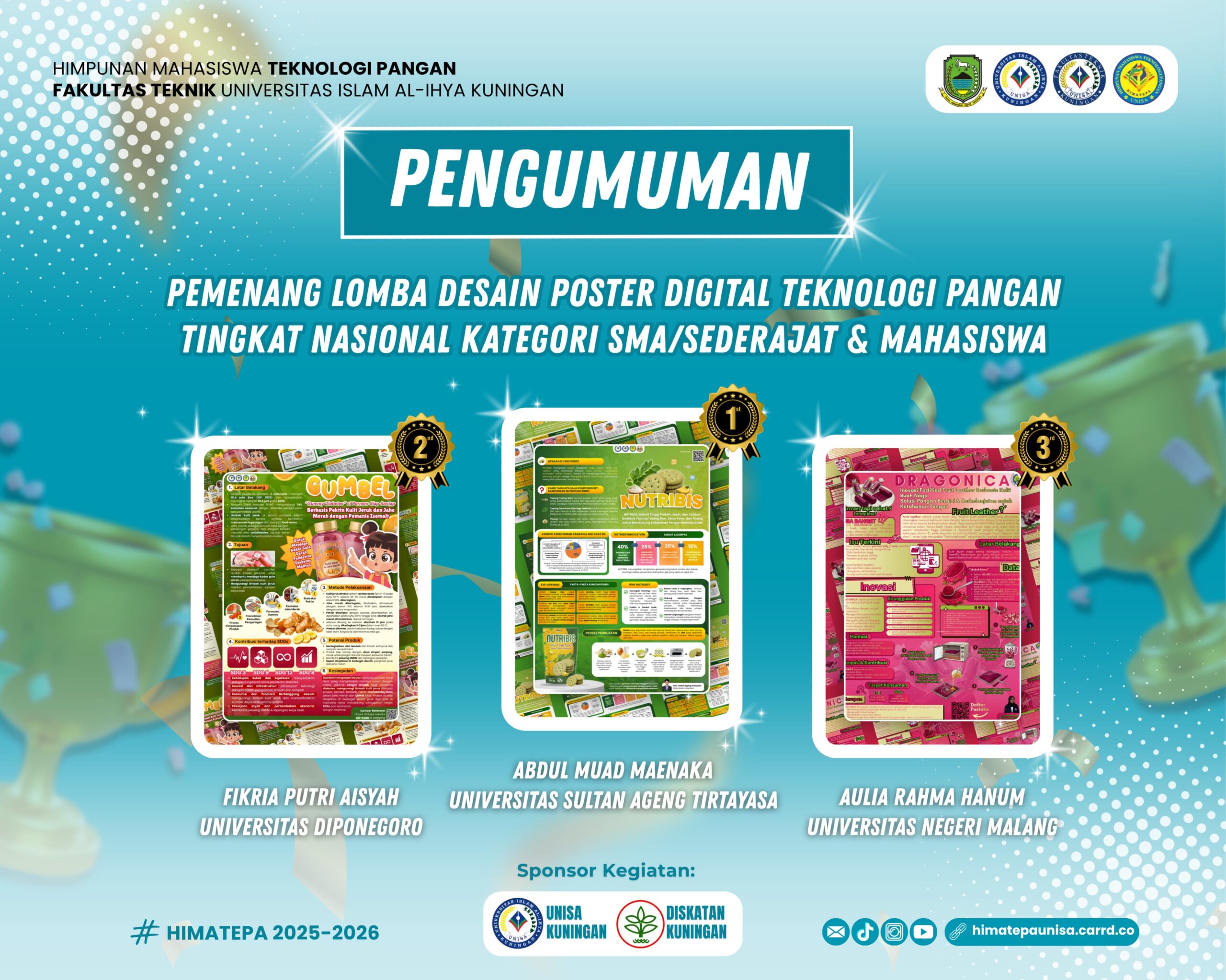 KUNINGAN, (FC).- Abdul Muad Maenaka, mahasiswa Universitas Sultan Ageng Tirtayasa, meraih juara pertama dalam Lomba Desain Poster Digital Teknologi Pangan tingkat nasional yang digelar Himpunan Mahasiswa Teknologi Pangan Universitas Islam Al-Ihya Kuningan tahun 2026.