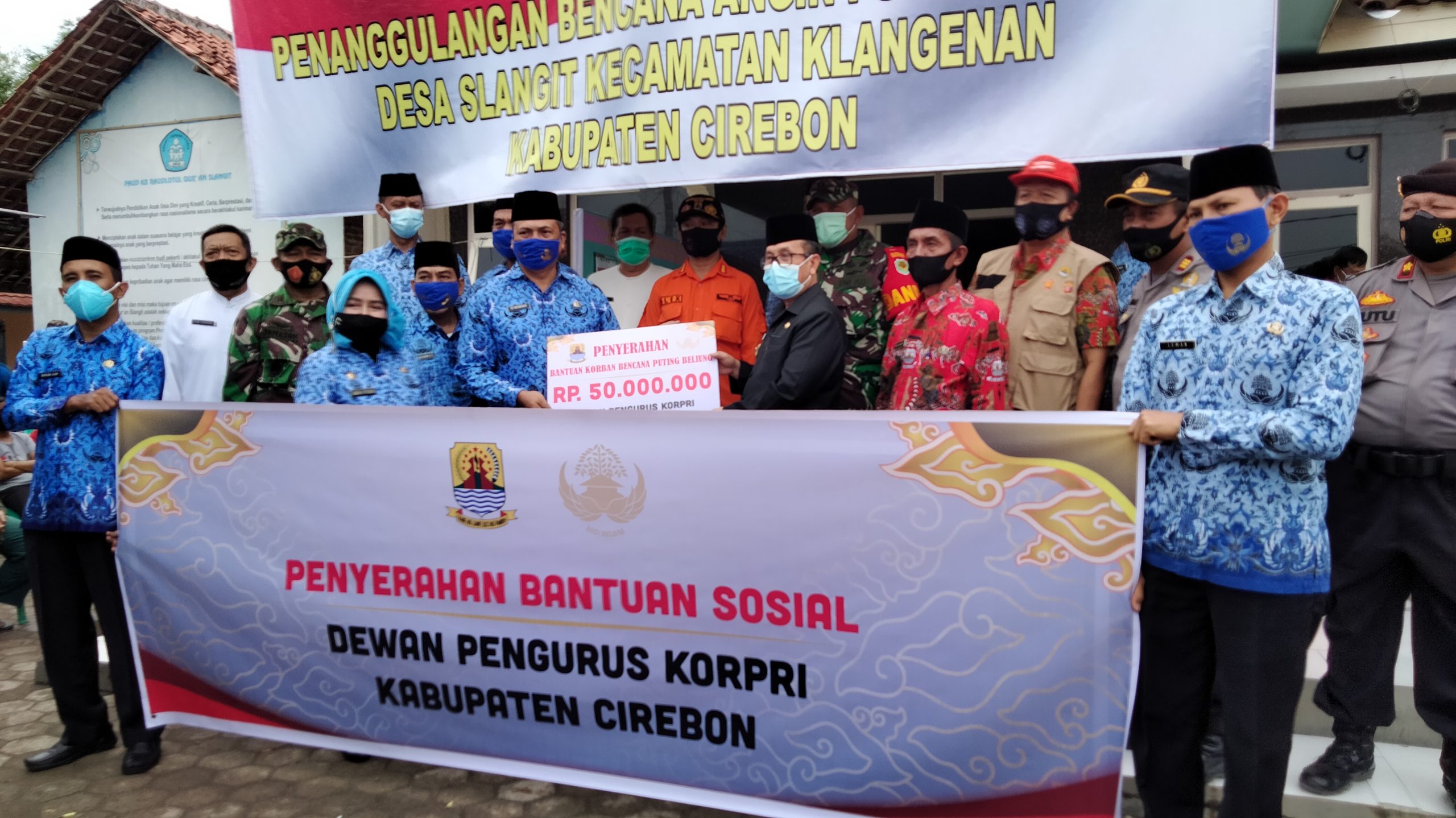 Korpri dalam menyalurkan pengabdiannya, baik kepada masyarakat umum maupun terhadap anggotanya adalah adanya sikap respek dan kepedulian terhadap berbagai permasalahan, seperti terjadinya musibah atau bencana alam yang saat ini dialami Kabupaten Cirebon yaitu angin puting beliung di Desa Slangit Kecamatan Klangenan.