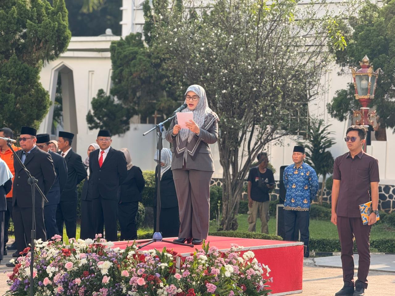 Wakil Wali Kota Cirebon, Siti Farida Rosmawati, bertindak sebagai inspektur upacara sekaligus membacakan sambutan Menteri Dalam Negeri Republik Indonesia yang menekankan pentingnya sinergi pusat dan daerah dalam mewujudkan pembangunan yang berkeadilan dan berkelanjutan.