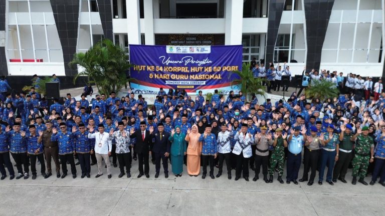 KOTA CIREBON, (FC).- Upacara peringatan Hari Ulang Tahun ke-54 KORPRI, Hari Ulang Tahun ke-80 PGRI, dan Hari Guru Nasional tingkat Kota Cirebon yang digelar di halaman Balai Kota pada Senin (1/12/2025) berlangsung khidmat.