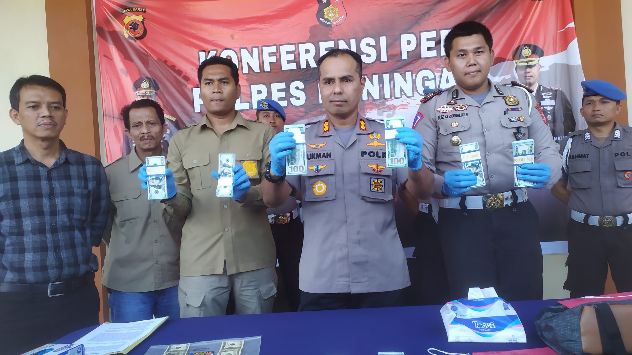 KUNINGAN.- Polres Kuningan berhasil mengamankan 736 lembar uang dolar palsu, dengan rincian 732 lembar uang pecahan 100 dollar keluaran terbaru dan 4 lembar uang pecahan 100 dollar model lama.