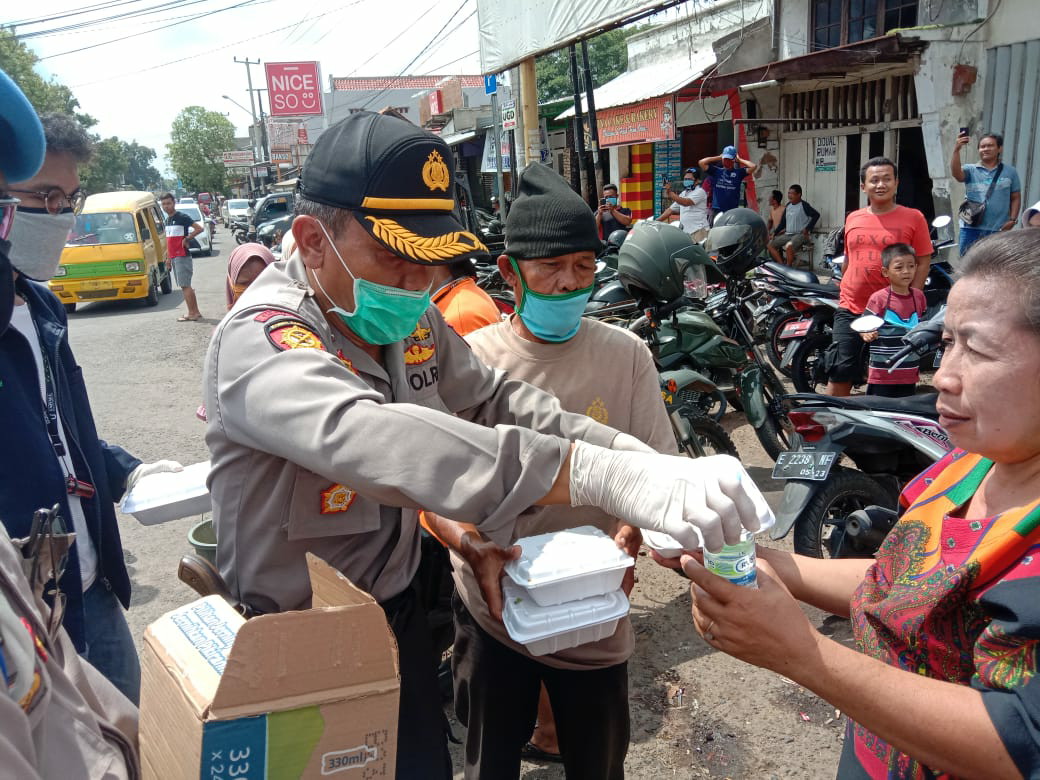 Sebanyak 500 nasi kotak dan masker ditebar untuk masyarakat terdampak covid-19 di Pertigaan Jalan Raya Cipeujeuh Wetan Kecamatan Lemahabang Kabupaten Cirebon