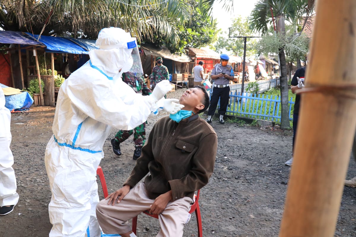 Swab test dilakukan secara acak terhadap pedagang, pembeli maupun warga yang melintas dengan mengukur temperatur tubuh, pendataan riwayat perjalanan dan pengambilan sampel dahak untuk dilakukan uji polymerase chain reaction (PCR) di laboratorium.