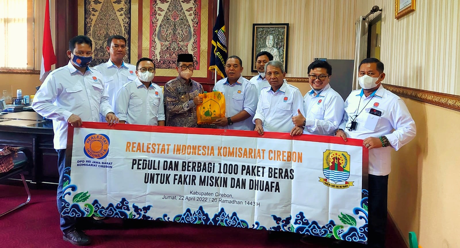 KAB. CIREBON, (FC).- Pengurus Real Estate Indonesia (REI) Komisariat Cirebon berbagi kepedulian dalam bentuk bantuan 1000 paket beras untuk fakir miskin dan dhuafa di kabupaten Cirebon.