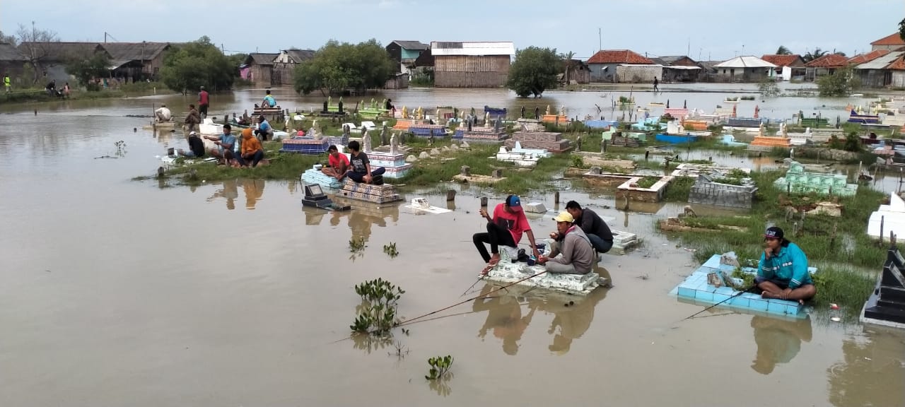 Warga ramai-ramai memancing ikan di jalur pantura bahkan tempat pemakaman umum yang terendam banjir.