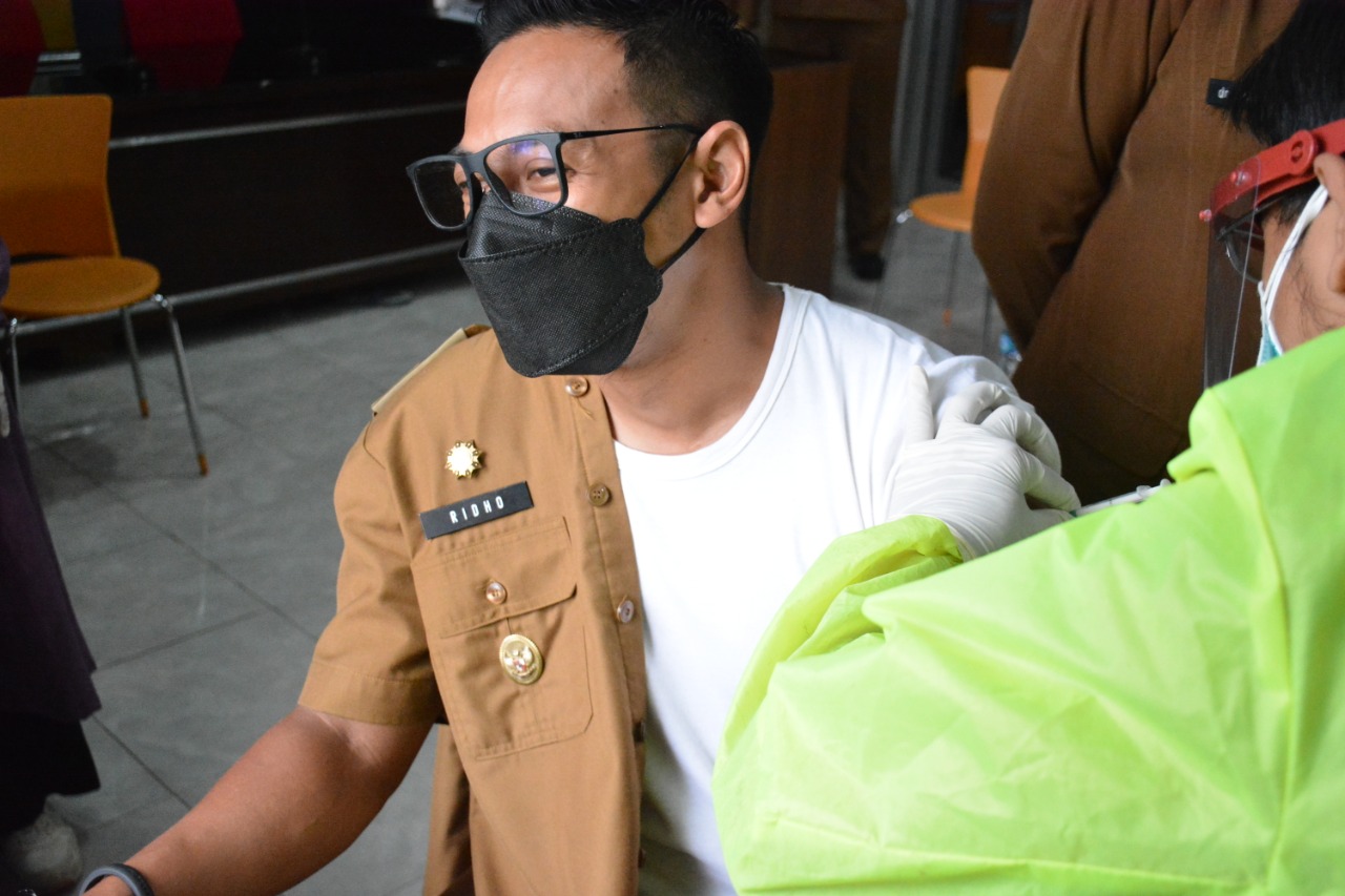 KUNINGAN,(FC).- Untuk kedua kalinya, Wakil Bupati Kuningan, H. M Ridho Suganda bersama jajaran Forkopimda Kabupaten Kuningan, dan tokoh agama menjalani penyuntikan vaksin Covid-19 di UPTD Pusat Kesehatan Masyarakat (Puskesmas) Lamepayung, Kecamatan Kuningan, Senin (15/2).