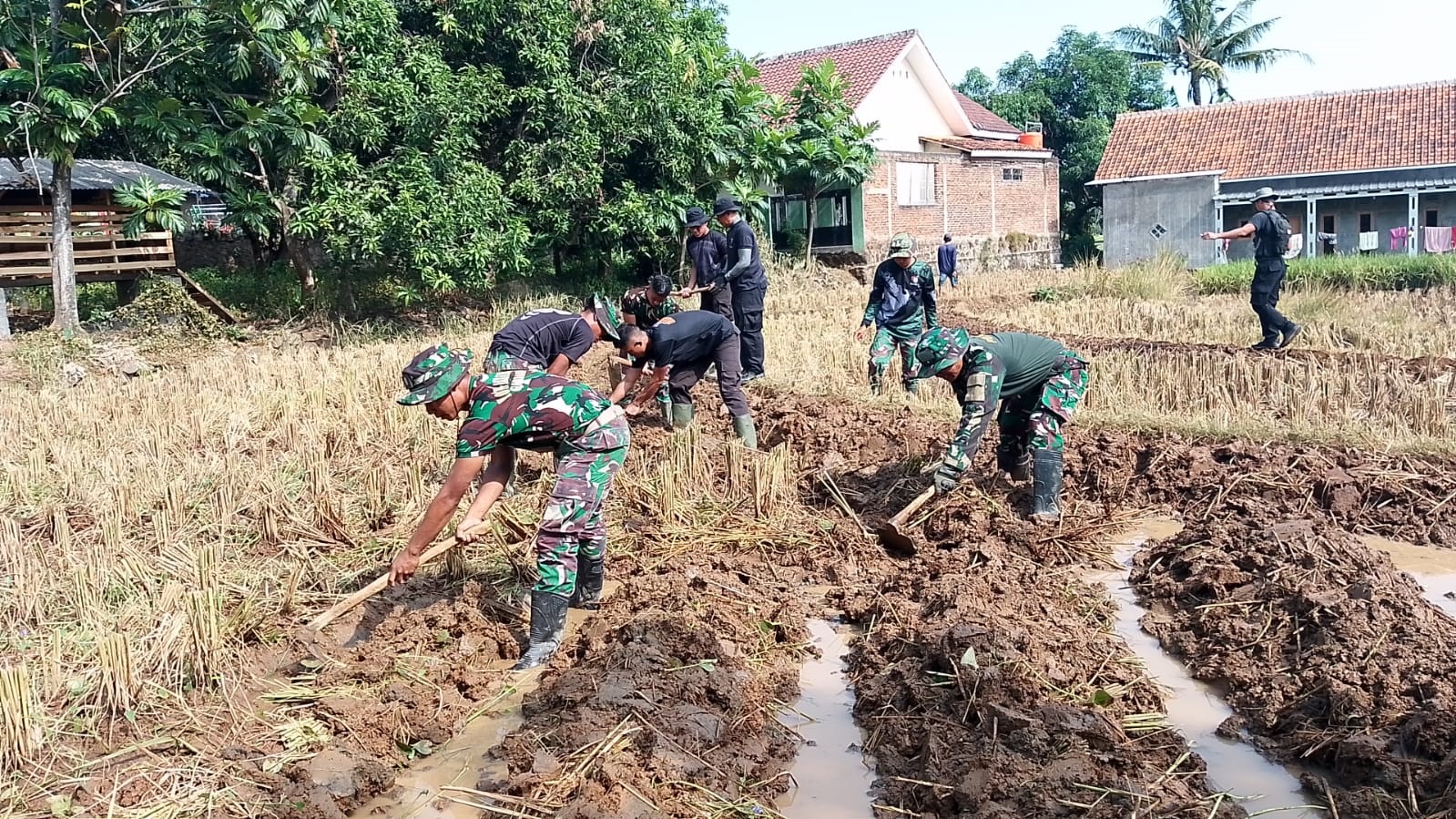 SEJUMLAH PERSONEL Kodim 0620/Kabupaten Cirebon saat membatu garapan lahan sawah di Desa Kubang, Kecamatan Talun, Kabupaten Cirebon.* (Foto: Ist/FC)