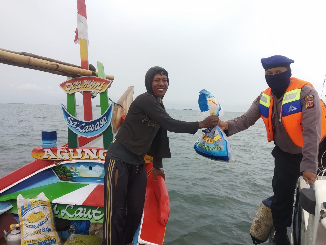 Setelah membagikan sembako di daerah Pamengkang, Sat Polair melanjutkan membagikan kepada nelayan yang sedang melaut.