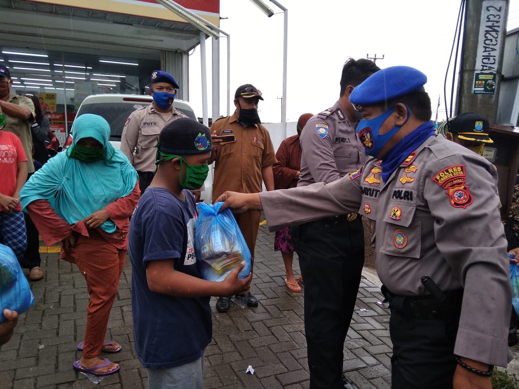 KOTA CIREBON, (FC).- Satpolair Polres Cirebon Kota membagikan sembako dan masker untuk masyarakat serta nelayan di dua lokasi yang berbeda di Kota Cirebon, Selasa (21/4).