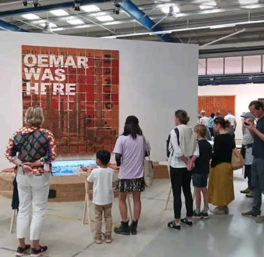 Dengan menggunakan media keramik, JAF menampilkan sosok di balik karya Genteng Jatiwangi. Tulisan ‘Oemar Was Here,’ terpampang pada keramik seni rupa yang dipamerkan di sana.