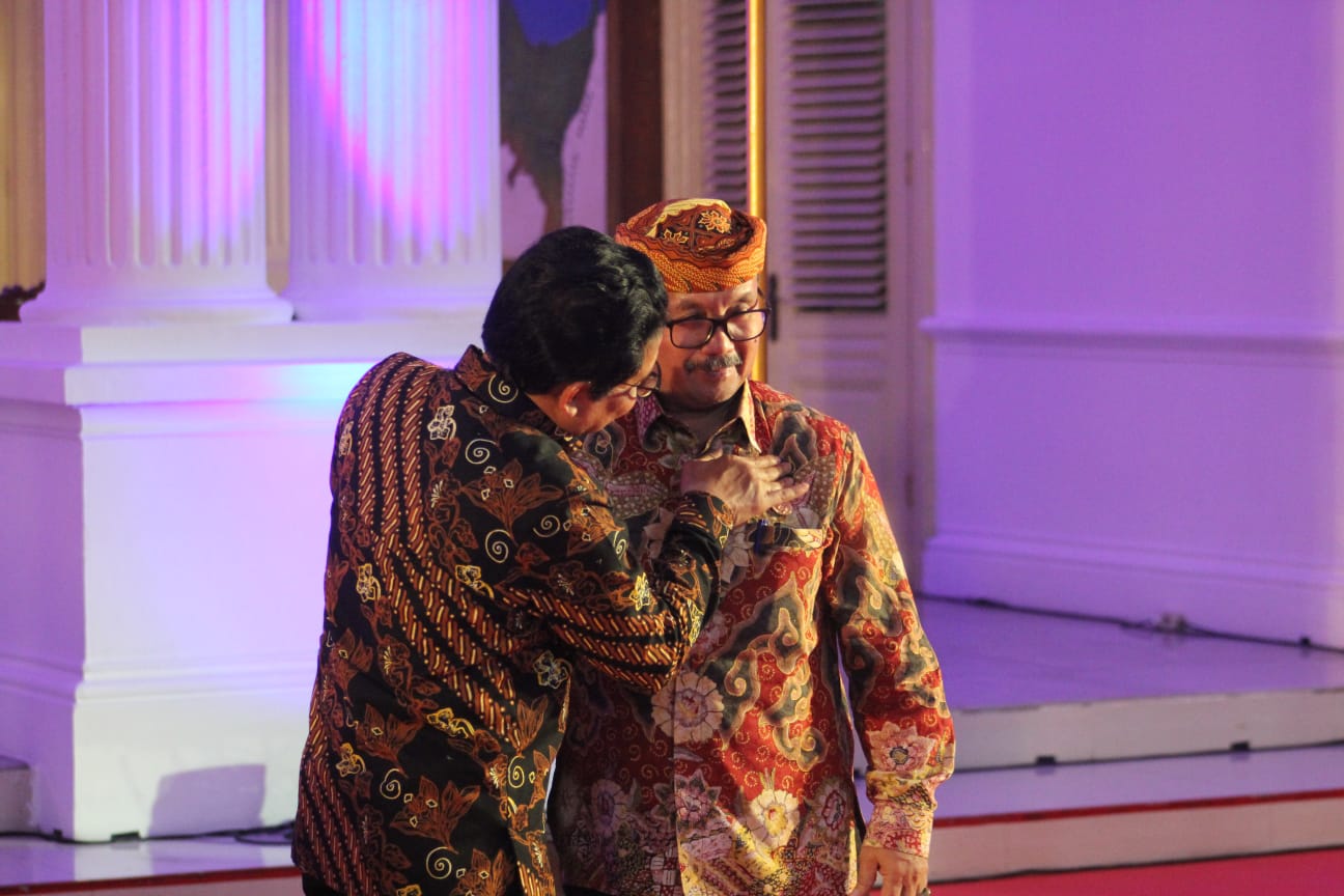 MENDES PDTT, Abdul Halim Iskandar memberikan lencana Bakti Desa Utama kepada Bupati Cirebon, H Imron yang berhasil merubah status desa di Kabupaten Cirebon.* (Foto: Ist/FC)