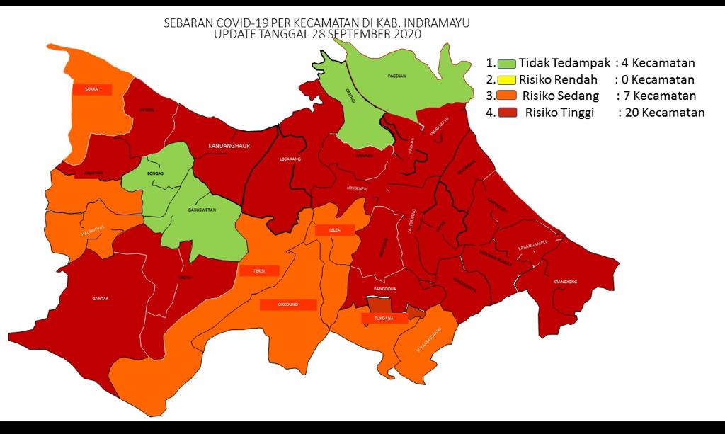 INDRAMAYU, (FC).- Sedikitnya 20 Kecamatan di Kabupaten Indramayu masuk Zona Merah dan memiliki resiko tinggi terhadap penyebaran Covid 19. Data Ini bertambah jika dika dibandingkan data senin (14/9/2020) lalu yang hanya 17 kecamatan.